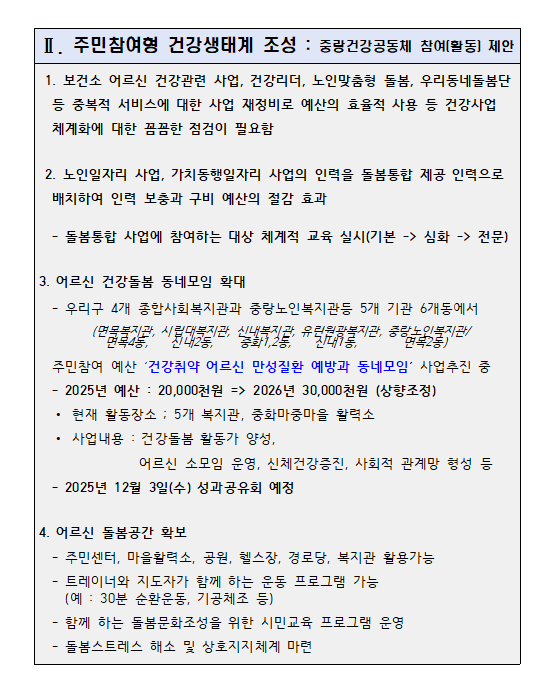 중랑구의 초고령 시대를 건강하고 행복하게 보낼 수 있도록 다함께 둥글게 힘을 모아야 하겠습니다.