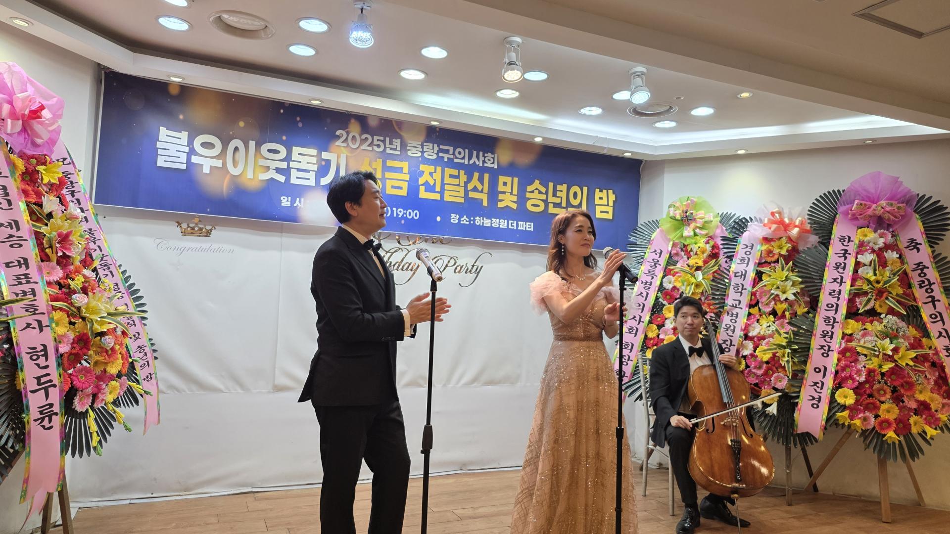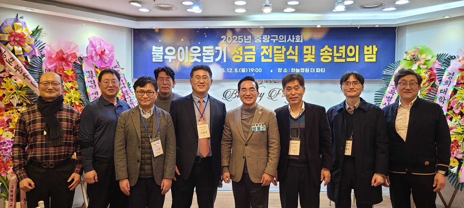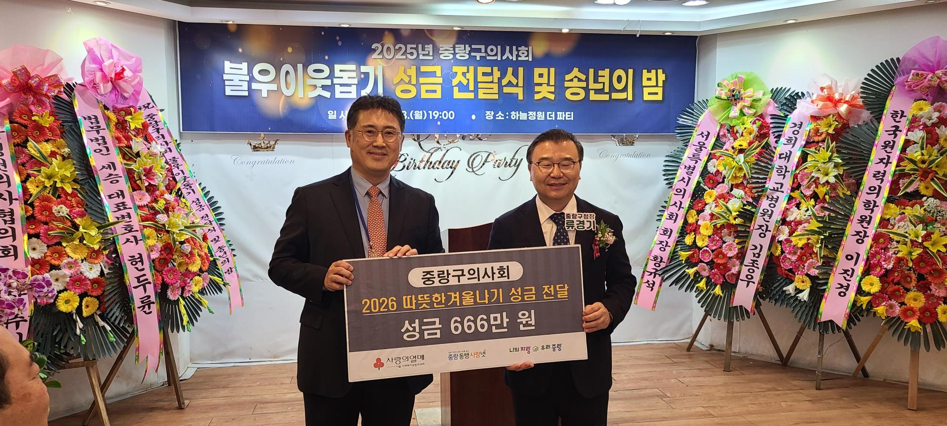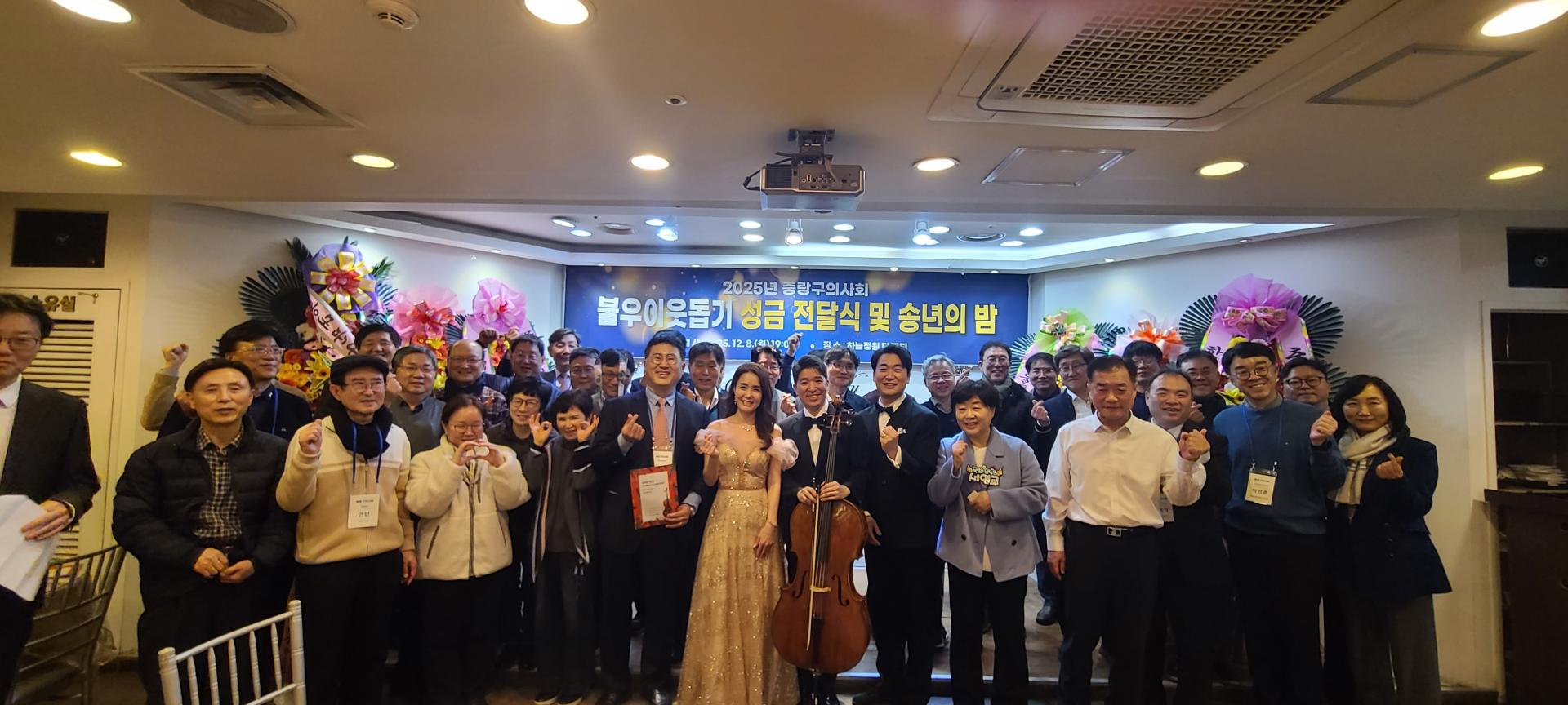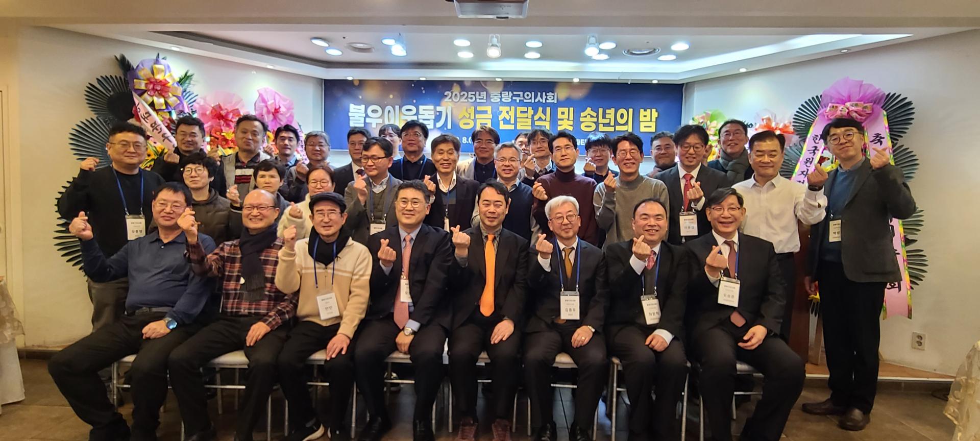 어려운 가운데서도 중랑구 의사회와 함께 해주신 여러분께 감사드립니다. 백세 시대를 맞이하여 건강의 가치가 더욱 소중해지고 지역 사회의 긴밀한 협력이 더욱 중요해지는 것 같습니다. 어려운 가운데서도 함께 해주신 협력 기관 여러분과 지역 의료 현장에서 고생하신 회원 여러분께 감사드립니다. 불우이웃돕기 성금 전달식과 송년회에 참석하여 자리를 빛내주신 여러분께 감사드리며 건강하고 행복한 연말연시기 바랍니다.