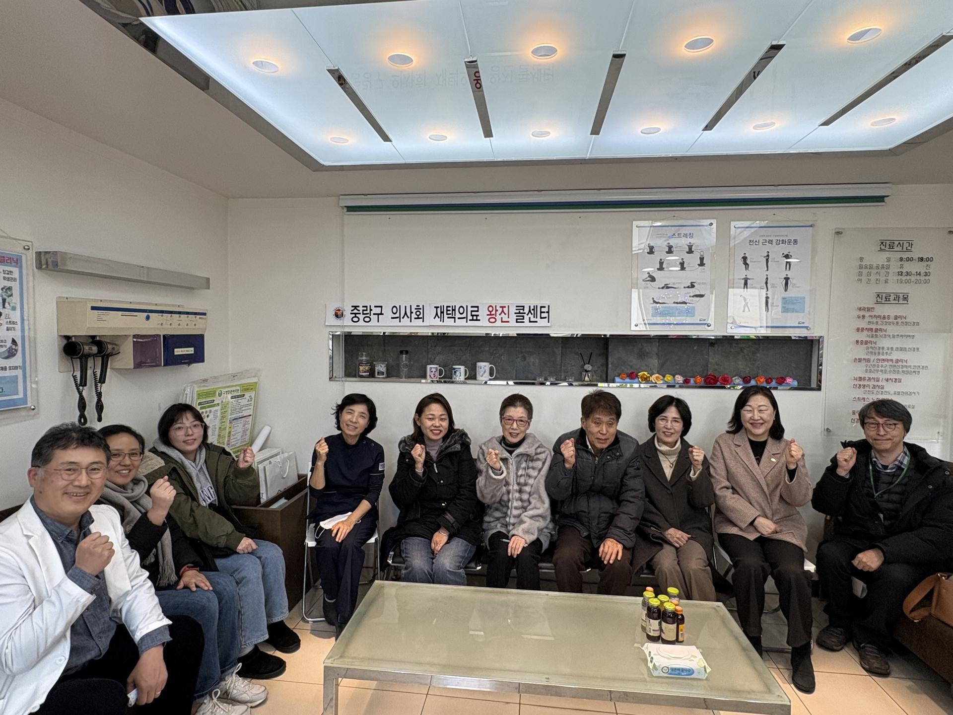12월 11일 점심 1시 미래신경과 회의실 ( 참석자 오동호 중랑구 의사회장, 서은영 약사회장, 김영미 중랑건강공동체 공동대표, 서홍희 보건소장, 주홍선 팀장, 김봉구 녹색병원 명예원장, 구청 복지과 주무관, 송제형 녹색병원 과장, 녹색병원 방문간호팀장, 미래신경과 간호사등 )